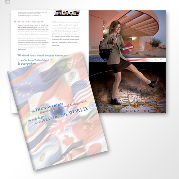 Founded in 1946, Thunderbird is the oldest graduate management school focused exclusively on global business. Regarded as the world's leading institution in the education of global managers, the curriculum is based on the principle that to do business on a global scale, executives must not only know the intricacies of business, but also understand the customs of other countries and be able to communicate with different cultures. Worldwide, 35,500 Thunderbird alumni live and work in more than 140 countries. This brochure was a transitional piece from focusing on the unique features and benefits of attending Thunderbird.