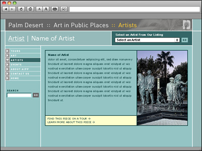 The City of Palm Desert California sponsors a very extensive nationally known public arts program entitled 'Art in Public Places'. This site is dedicated to enhancing this vital program by housing an extensive art and artist database, event listing, public and private tours, as well as local galleries. This site serves as a portal for the art community throughout the Coachella Valley.