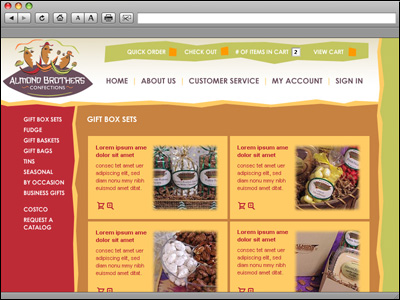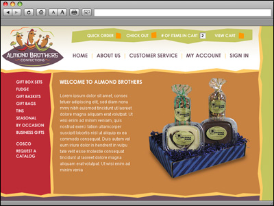 Almond Brothers is an e-business specializing in almond based corporate gift products. It currently does a majority of its business through catalog sales and online orders with shipments going worldwide. Thanks to the many repeat customers who have ordered year after year and the many new customers who find us each season we plan on growing and maintaining the same consistent quality product and great customer service for many years to come. Unfortunately, Almond Brothers has not embraced their brand as exhibited by their current web site design rather settling on an inexpensive solution.