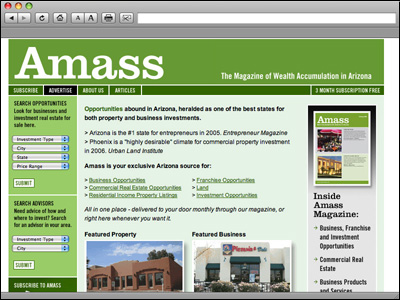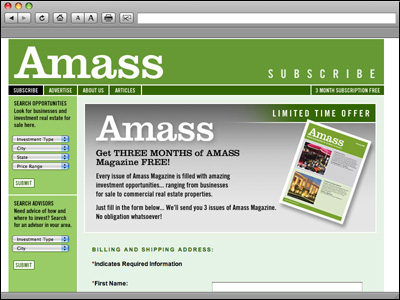 Amass Magazine is a monthly subscription based periodical as well as a web-based marketing engine designed to allow brokers, real-estate agents, business-owners and others to market and sell investment opportunities, real-estate, land, business opportunities, and other investment based assets. |