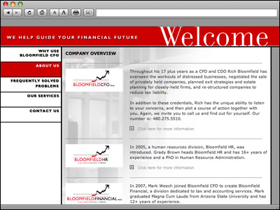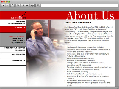 Bloomfield CFO is a CFO for hire company designed to work with distressed businesses with such services as negotiated sales of privately held companies, planned exit strategies, estate planning for closely-held firms, and re-structuring companies to reduce tax liability. |