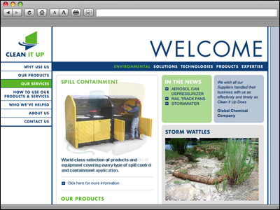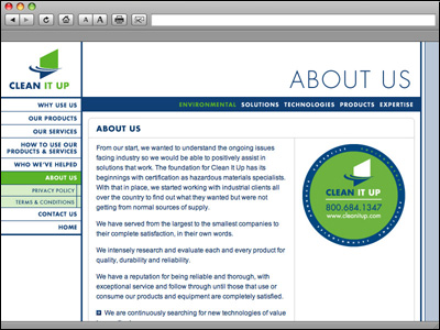 Clean it Up is an hazardous materials clean up solutions based company located in Surprise Arizona. Clean it Up provides solutions, technologies, products and expertise to wide ranch of businesses and organizations such as government agencies to large and small companies throughout North America. This site is designed to add an e-commerce element as it evolves in future iterations. |