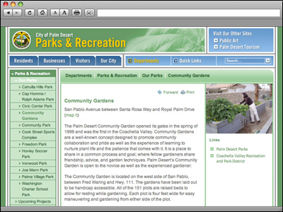 This site is the government arm of the City of Palm Desert California. This site is the primary communication arm representing the city in all aspects of doing business with the general public. Anything you need to know about the city and doing business is contained here. Designed for optimum usability, content layout, as well as an accurate representation of the city itself, this site has been a welcome addition.