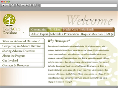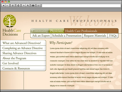 | Health Care Decisions is a program of Hospice of the Valley in Phoenix, Arizona devoted to educating the community about advance directives, which state individuals' wishes about their health care treatment. They urge people to think about their options, discuss their wishes with family and friends, and ultimately put their choices in writing. This site was designed and produced in partnership with Sitewire Marketspace Solutions, Tempe, Arizona |