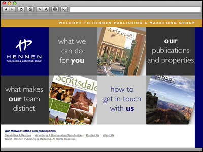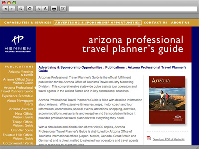 Hennen Publishing & Marketing Group was originally established as Arizona Meetings and Events, Inc. and was initially comprised of one product - Arizona Meetings and Events Magazine. Since then, our publishing, marketing, and sales program has grown rapidly - positioning us as a leader in Arizona tourism publishing and as a sales representation firm, based on annual revenue and quantity and quality of visitor publications. |