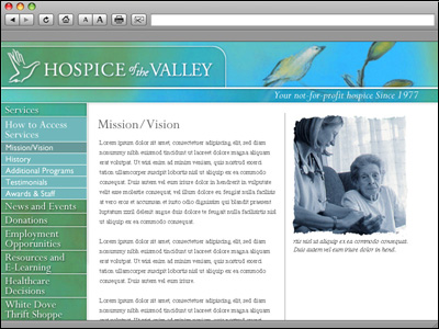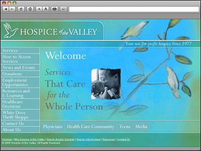 Hospice of the Valley's mission focuses on caring, not curing. Hospice treats the whole person – body, mind and spirit – as well as nurturing the family. When someone has a life-limiting illness, everyone needs support. A team of professionals – doctors, nurses, social workers, nurse's aides, pastoral counselors and volunteers - delivers the care, usually in the patient's home. They assist with the transition, helping patients stay pain-free, comfortable and fully engaged in their lives. Unfortunately, the current web site represents a more webified approach to site design and does not accurately reflect the personality of Hospice of the Valley.