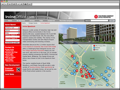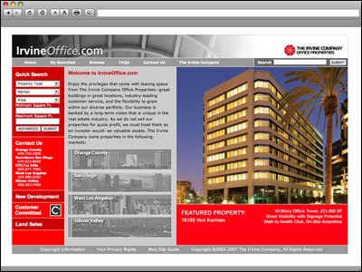 The Irvine Company is a 140-year-old privately held real estate investment company best known for the balanced, sustainable communities it continues to plan and create on The Irvine Ranch® in Orange County, California. It also is known for its portfolio of high-quality investment properties - office, retail and apartment - it owns in San Diego, Orange County, West Los Angeles, and the Silicon Valley. The company traces its roots to the 1860s with the assembly of the ranch from Mexican and Spanish land grants. The Irvine Company was incorporated in 1894. Irvine Office is backed by a long-term vision that is unique in the real estate industry. They do not sell properties for quick profit, they treat them each property as an investor would - as valuable assets. The Irvine Company owns properties in the following markets; Orange County, San Diego, West Los Angeles, and Silicon Valley.