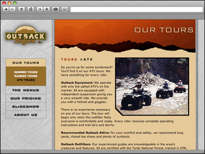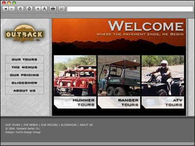 Boasting 12 years of experience, the Outback Safari Jeep, Hummer, ATV and Polaris tours service the tourism market of the greater Phoenix and Scottsdale market. This site was designed to educate their customers on their tour products and expertise, all customers to price and investigate tour opportunities, and to book an experience online. |