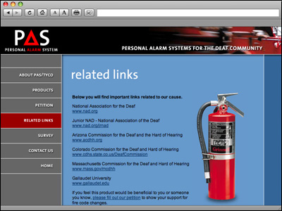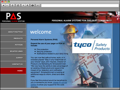 PAS for deaf is a revolutionary product concept developed for the deaf. In partnership with TYCO Safety Products, this system uses a myriad of communication divices such as pagers, cell phones, and others to offer alerts to warn the deaf of various threats. The end benefit is peace of mind for individuals on the go to know they are safe from any threat that may jeopardize their personal safety. |