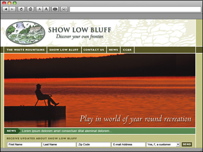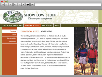 Located in the White Mountains of Arizona, Show Low Bluff is a master planned community marketed to both primary and second home markets. Show Low Bluff spreads over more than 1,500 acres of mountain grasslands and pines. Show Low Bluff is designed with parks, trails, lakes and streams designed to compliment the region and augment the enjoyment of life in the White Mountain area. The The Brand Navigator did not design the current site.