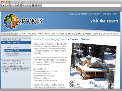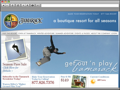 Tamarack Idaho Resort is located in the heart of Idaho’s magnificent Payette River Mountains, is the first newly permitted four-season resort in North America in more than two decades. The resort features an extraordinary blend of mountain, meadow, and lake amenities for you to embark on your trailhead to discovery. This site was designed in a consultative role, in conjunction with Sitewire Marketspace Solutions of Tempe, Arizona, to provide their designers and programmers visual cues from which to build their site from. |