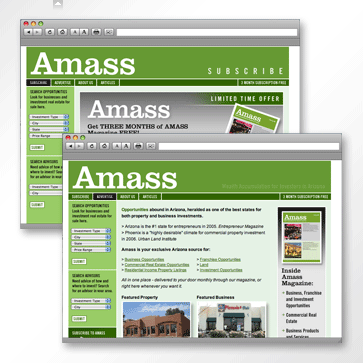 Amass Magazine is a monthly subscription based periodical as well as a web-based marketing engine designed to allow brokers, real-estate agents, business-owners and others to market and sell investment opportunities, real-estate, land, business opportunities, and other investment based assets. | | |