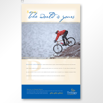 This marketing campaign was designed to attract a more active adult audience to the very successful development called Trilogy by Shea Homes. Located throughout the western United States, this community features many unique offerings designed for adults with a more active and adventurous life-style.