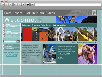 The City of Palm Desert California sponsors a very extensive nationally known public arts program entitled 'Art in Public Places'. This site is dedicated to enhancing this vital program by housing an extensive art and artist database, event listing, public and private tours, as well as local galleries. This site serves as a portal for the art community throughout the Coachella Valley.